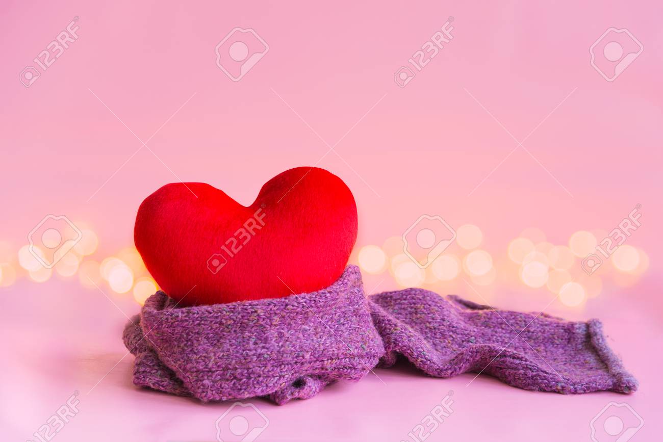 Coussin Coeur Rouge Doux Avec Echarpe Violet Violet Chaud Et Flou Lumiere Blanche Chaude Jaune Sur Joli Fond Rose Clair Avec Un Espace De Copie Pour La Decoration De Texte Ou D Insertion