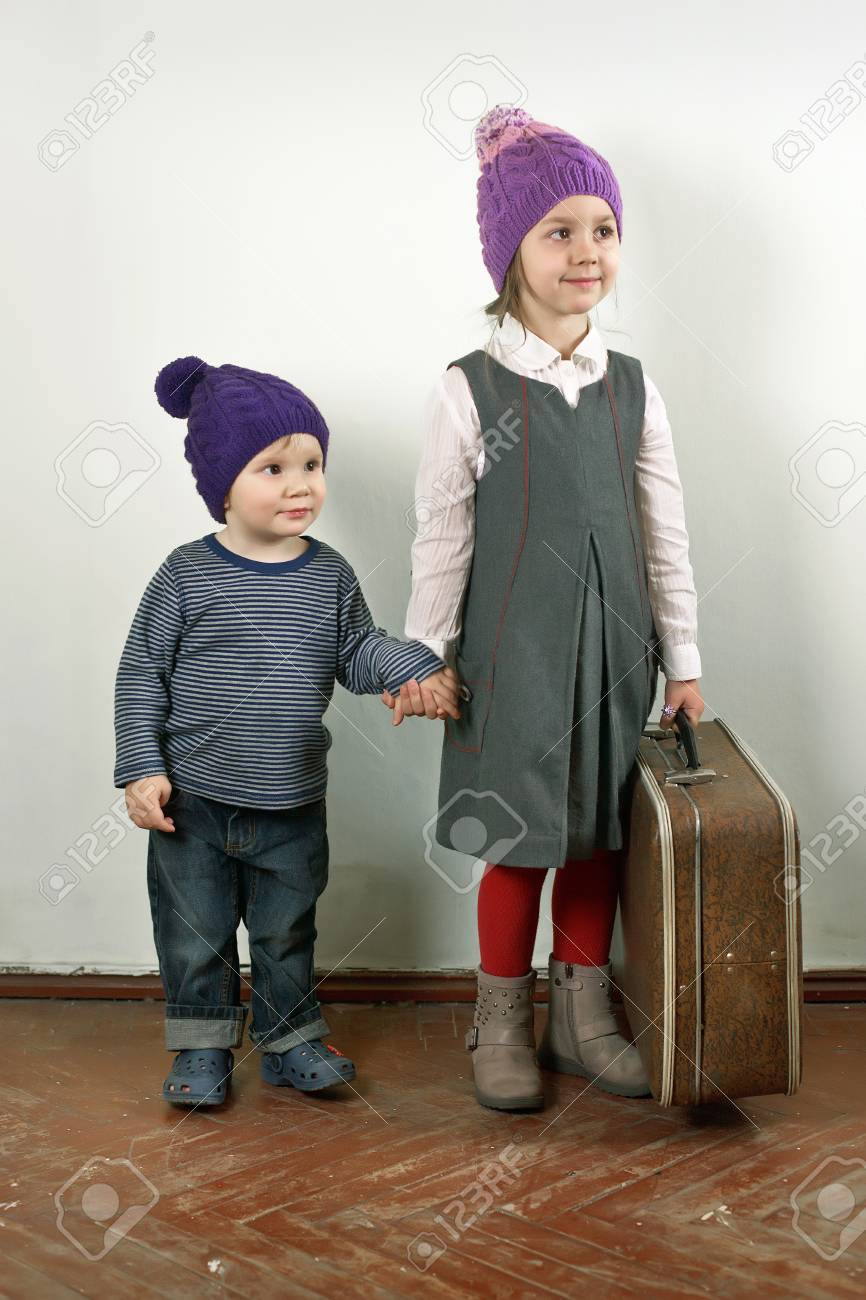 Garcon Et Fille Avec Les Vieilles Valises Tenant Par La Main Banque D Images Et Photos Libres De Droits Image 44339955