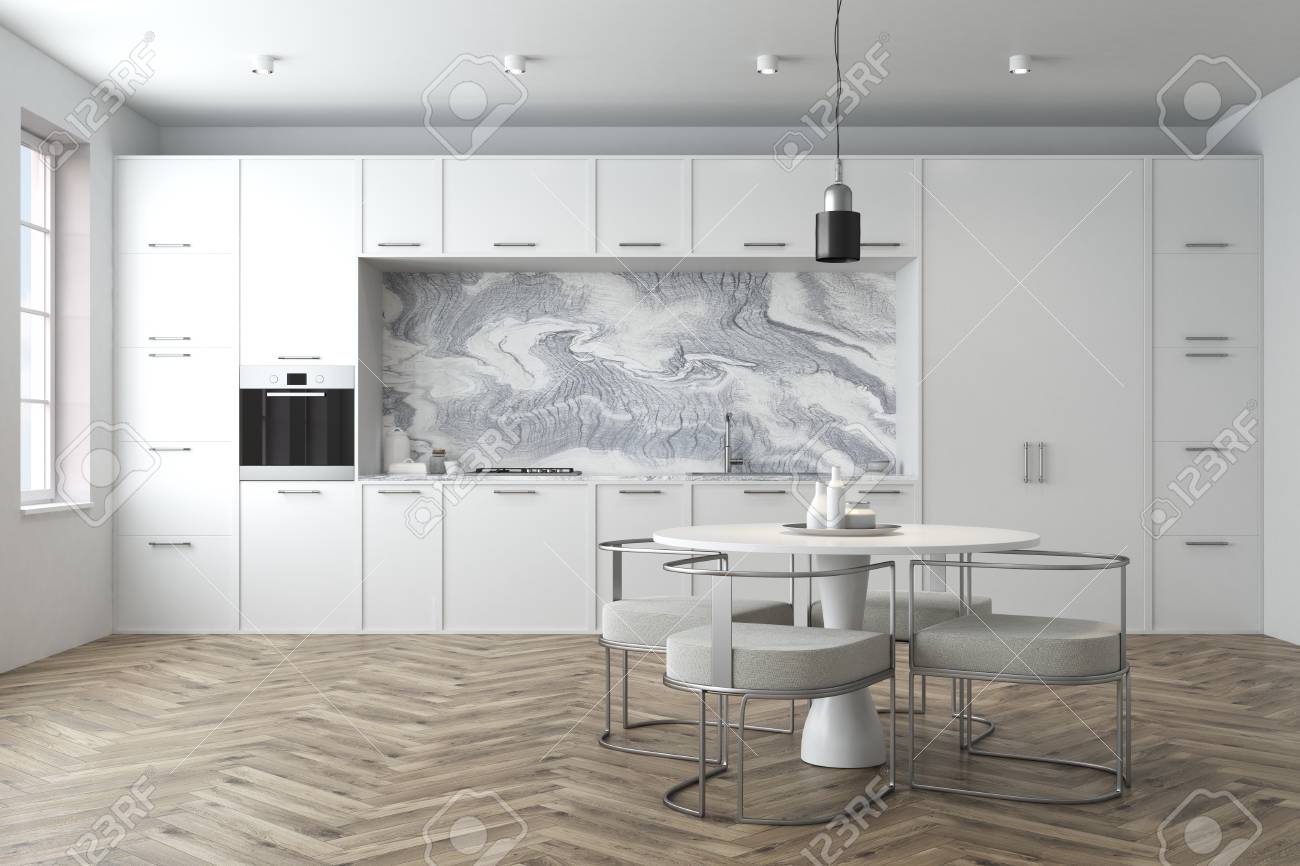 Interieur De Cuisine En Marbre Blanc Avec Un Plancher En Bois Une Grande Fenetre Des Armoires Et Des Comptoirs Blancs Et Une Table Ronde Avec Des Chaises Grises Douces Rendu 3d Maquette